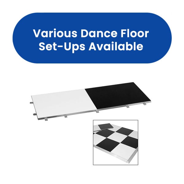 A black and white dance floor with a classic chequered design adds a timeless and elegant feel to any event. This modular set can be customised for different venue sizes and occasions like gala dinners or parties, with interlocking panels that make setup quick and secure. It’s designed for easy access with gentle edges, ensuring it’s safe and convenient on a hard, flat surface.