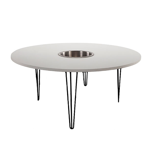 This dining table with a built-in wine cooler is a great option for events where you need a mix of style and practicality. It has a smooth white tabletop that doesn’t require a cloth, along with sturdy legs that seat up to seven people comfortably, and it keeps drinks chilled without any extra fuss. It’s a versatile choice for everything from corporate gatherings to casual parties, making it easy to set up and enjoy without the hassle of owning furniture.